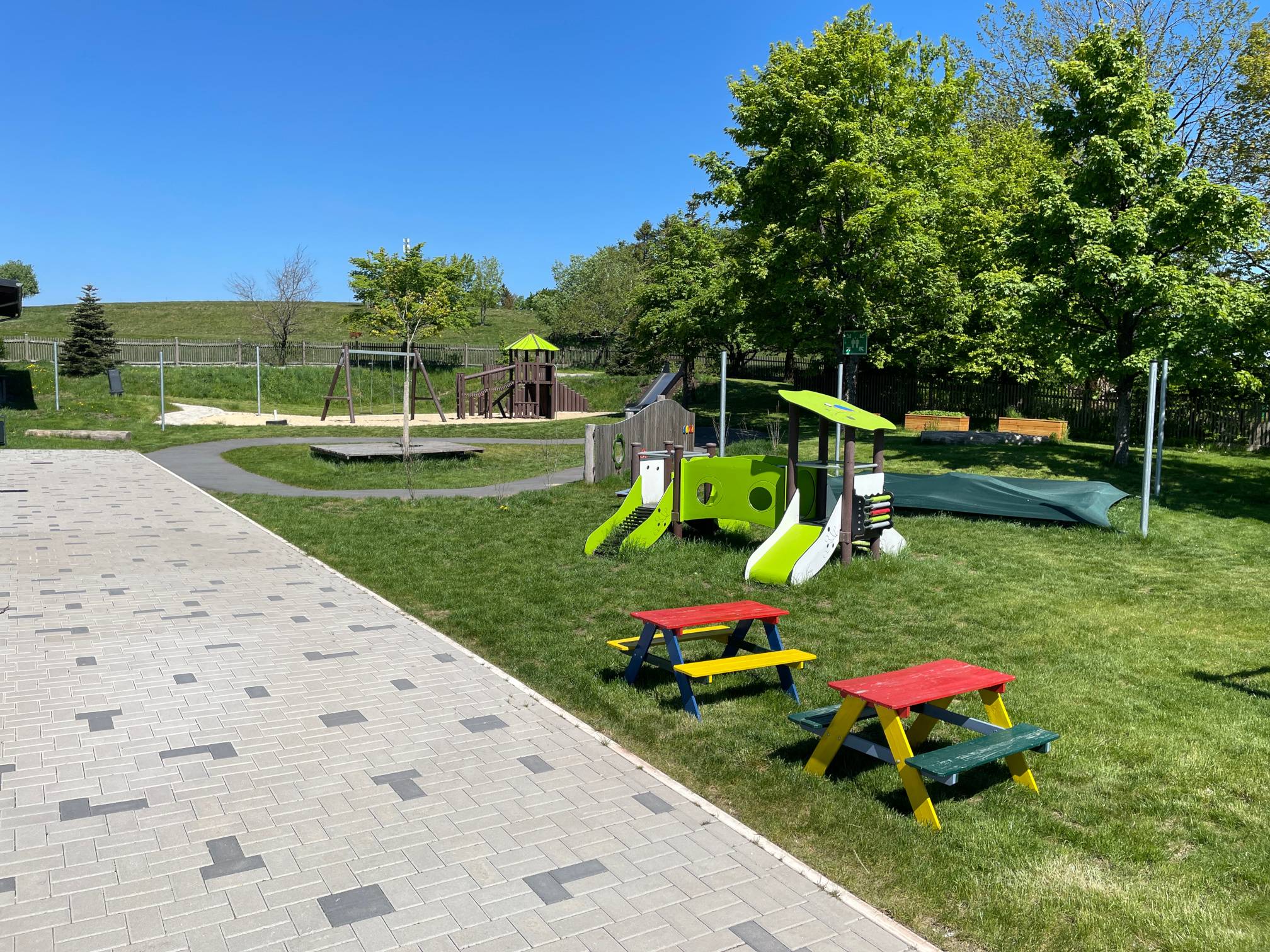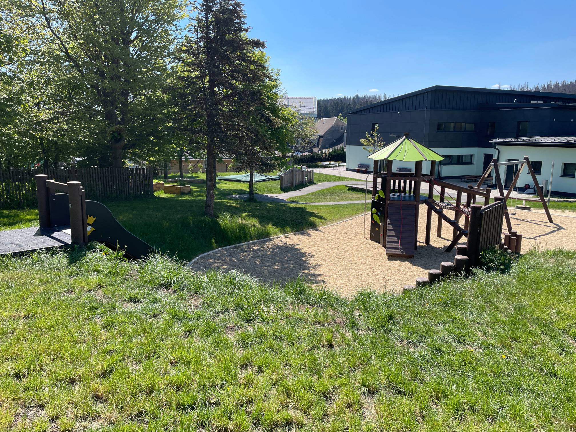 - Großzügiger Außenbereich, Spiel- und Klettergeräte für kleine und große Entdecker mit Frischwasser- und Matschbereich, Baum-Inseln und Hochbeeten