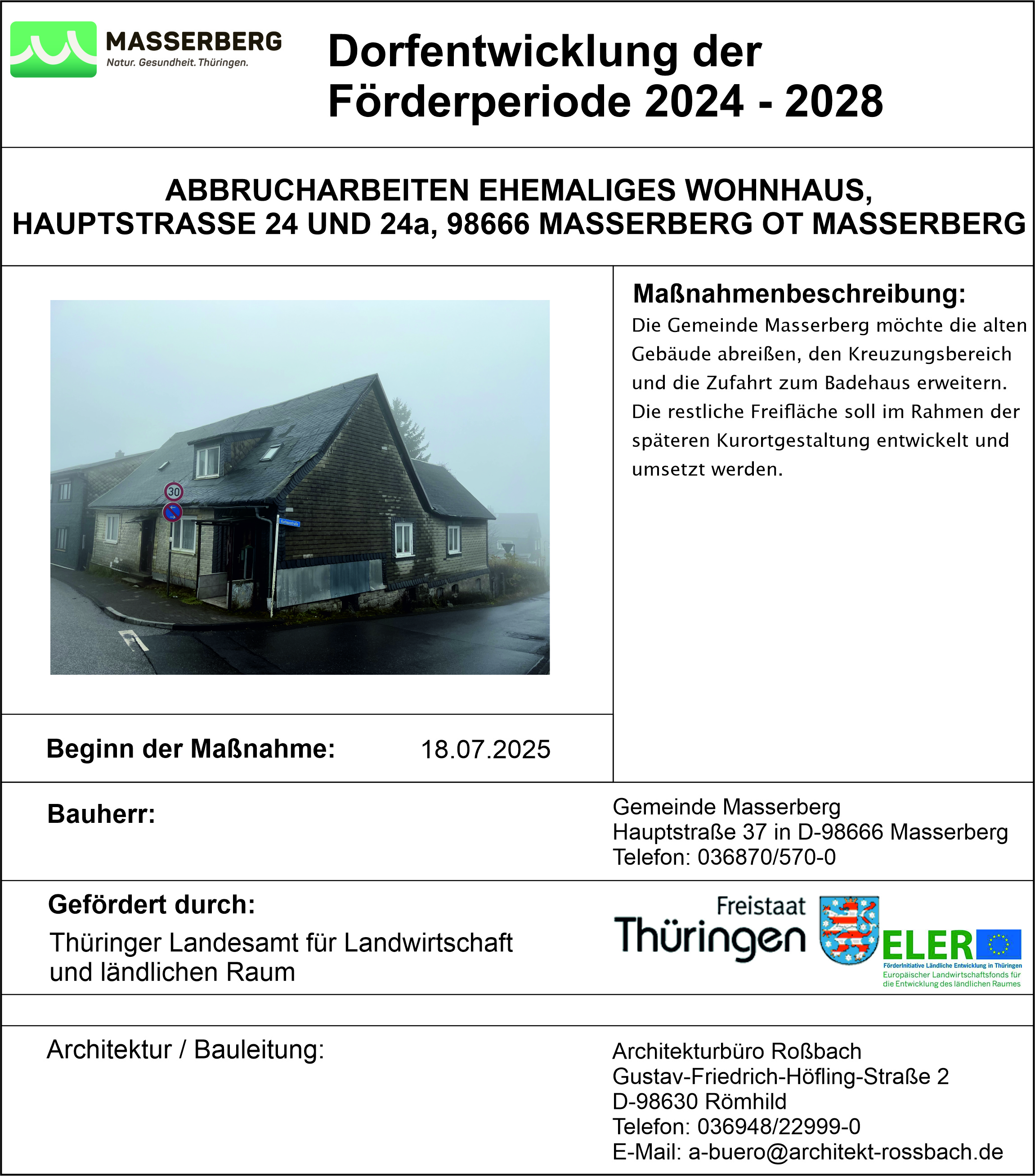 Das Wohnhaus in der Hauptstraße 24 und 24a steht im Ortsteil Masserberg in einer Engstelle eines Kreuzungsbereiches von Hauptstraße und Kurhausstraße. Die Kurhausstraße ist die Hauptzufahrt des in der Neuausrichtung und Attraktiverung befindlichen Badehauses in Masserberg. An dieser Kreuzung kam es oftmals zu problematischen Verkehrssituationen für große und kleine Fahrzeuge.
