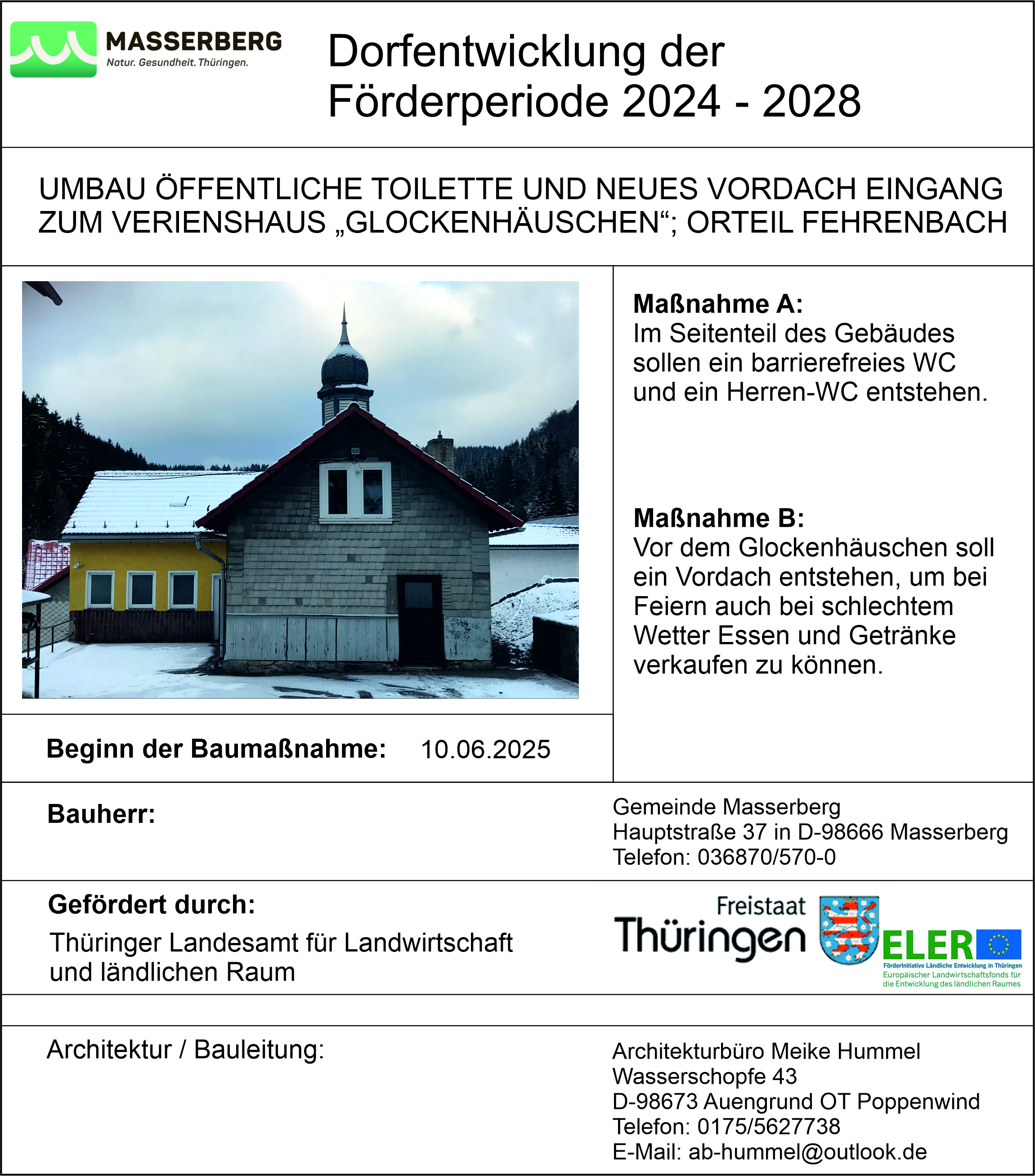 Die Gemeinde Masserberg versucht in den letzten Jahren in all seinen Ortsteilen die Zentren der Begegnung der Bürger und Gäste zu stärken. Neben der Neugestaltung des Saumarkts in Heubach, dem Bürgerhaus Schnett, dem Bürgerhaus Einsiedel incl. Freianlagen, ist das Vereinshaus „Glockenhäuschen“ der zentrale Punkt im Ortsteil Fehrenbach.