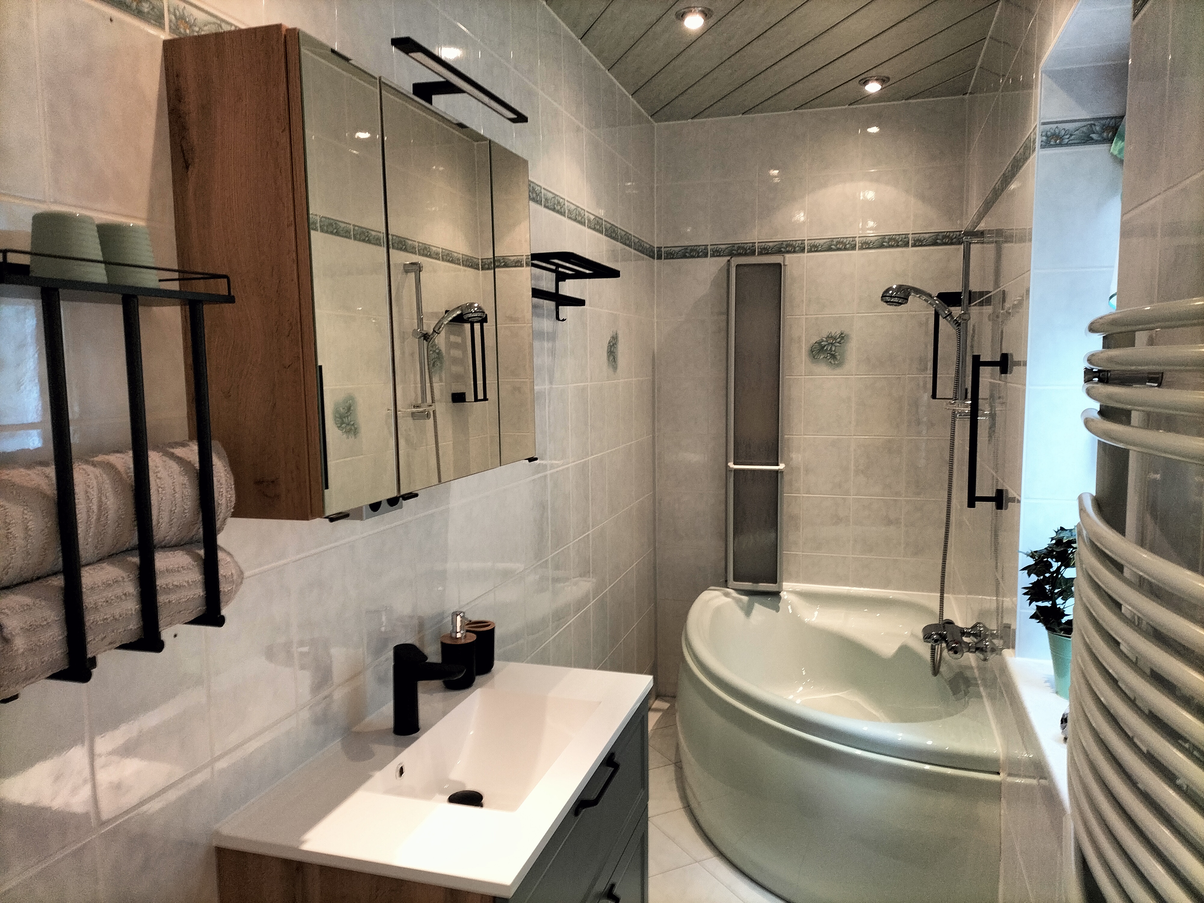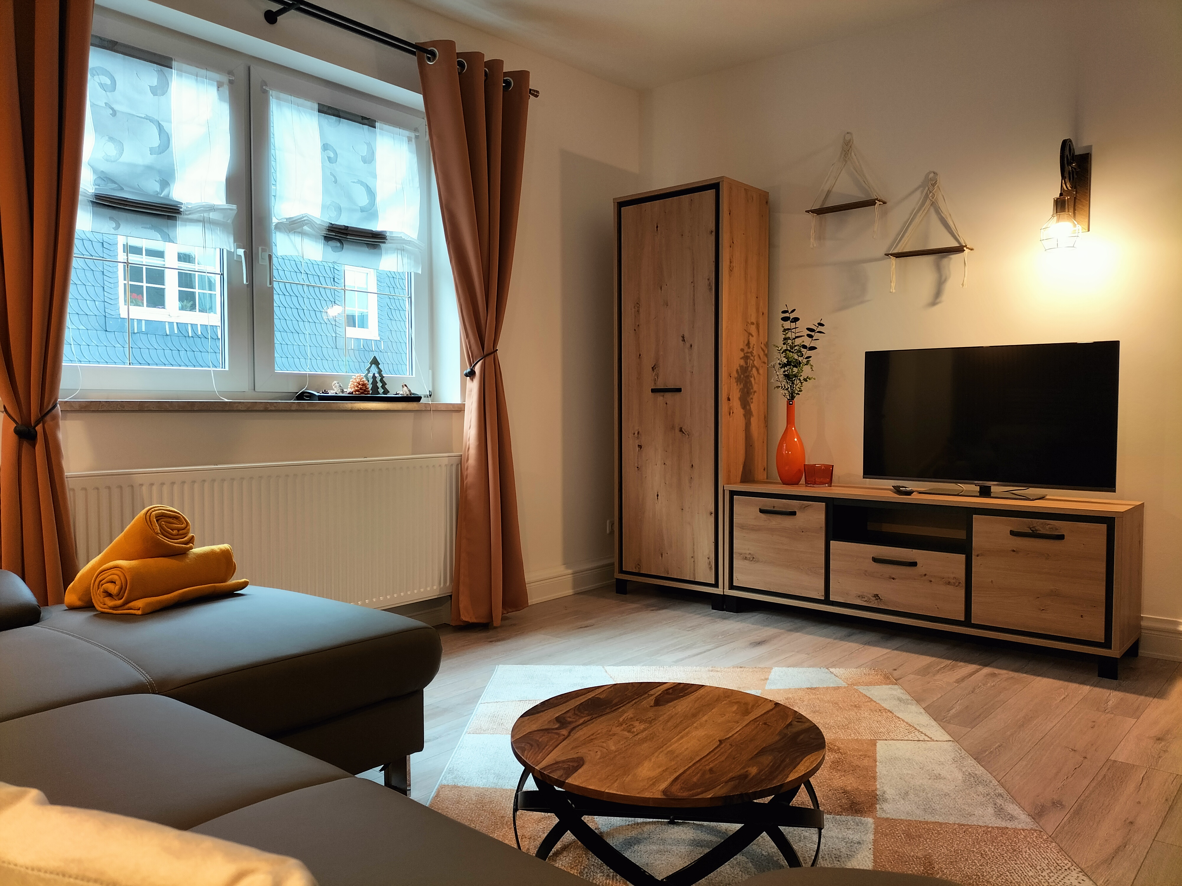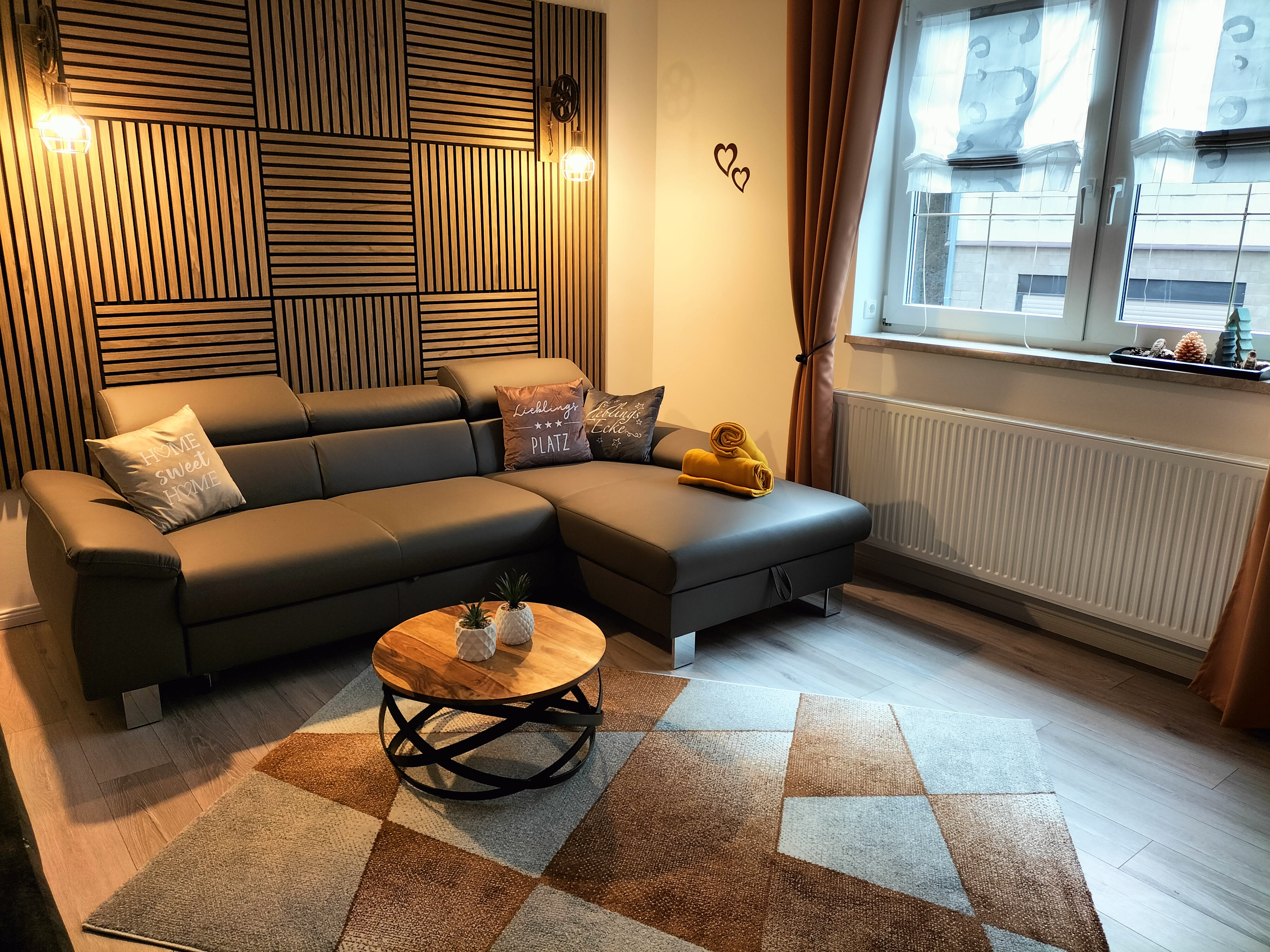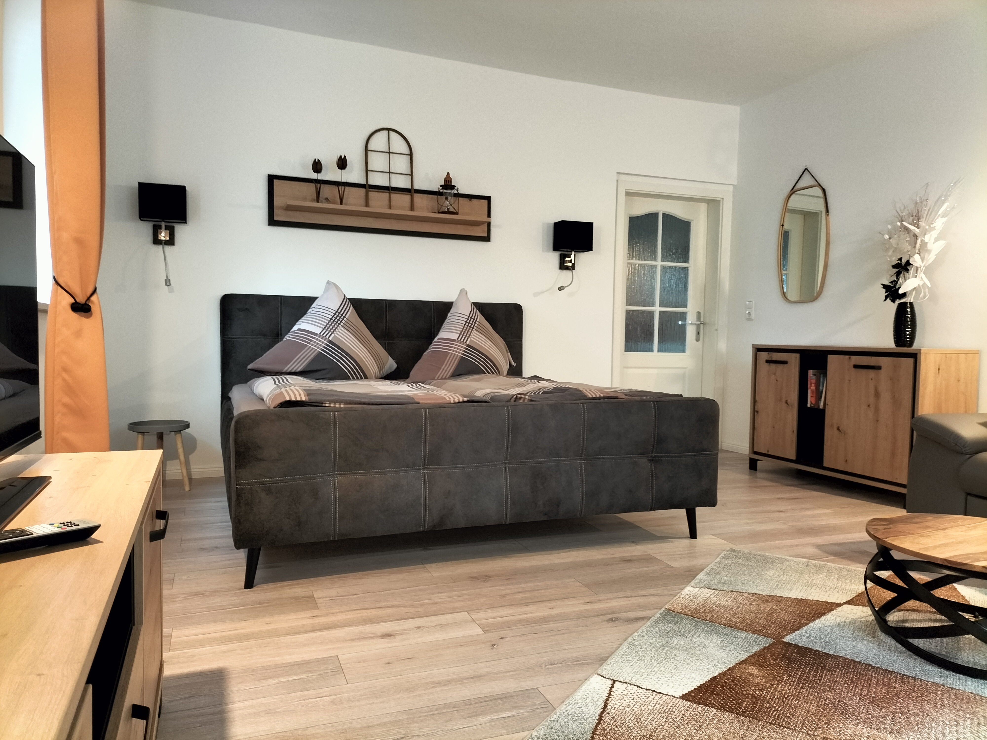 Entspannt Euch am Abend im modernen Wohnschlafzimmer, das mit einem bequemen Sofa, TV, stilvollen Holzelementen und einem gemütlichen Polsterbett eingerichtet ist. Oder lasst den Abend auf den nahe gelegenen Kurwiesen ausklingen. Im Badezimmer gibt es eine große Eck-Duschwanne. Handtücher und Bettwäsche sind bei Anreise vorhanden.