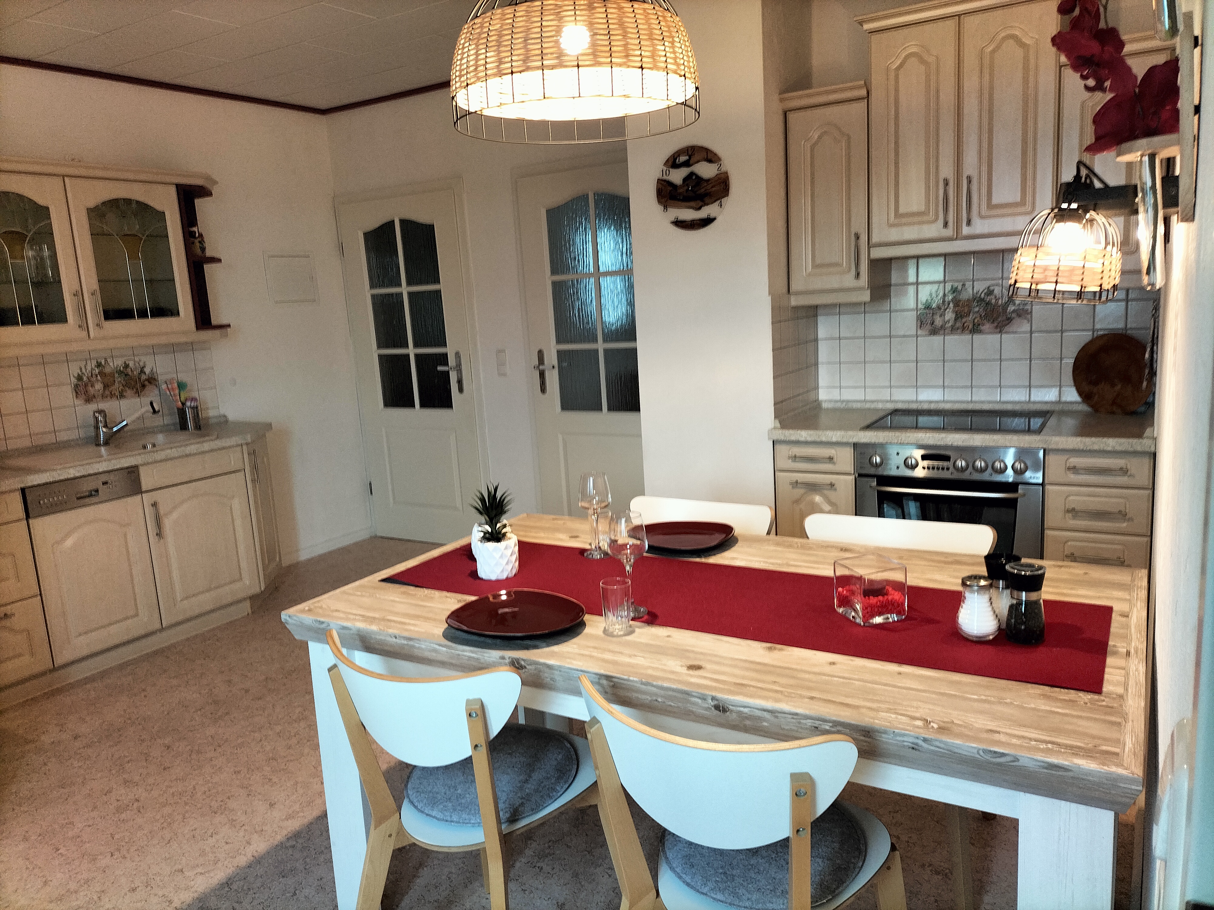 Die Ferienwohnung Runa ist mit einer gemütlichen Landhausküche ausgestattet, die alles bietet, was Ihr für Euren Aufenthalt benötigt: Kühlschrank, Kaffeemaschine, Besteck, Geschirr und vieles mehr. Der große Esstisch lädt ein, den Tag entspannt mit einem schönen Frühstück zu starten, um anschließend zu der ein oder anderen Wandertour aufzubrechen.